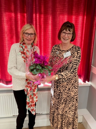 Rosie Rowe re elected as President 2026 presenting Helen Ebbitt WI Advisor with a beautiful plant.